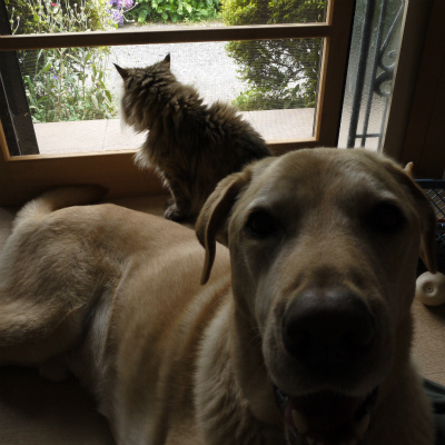 後ろで困った顔は ハピラブ保護犬『ロシナンテ』