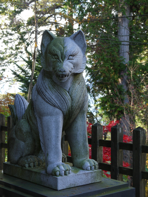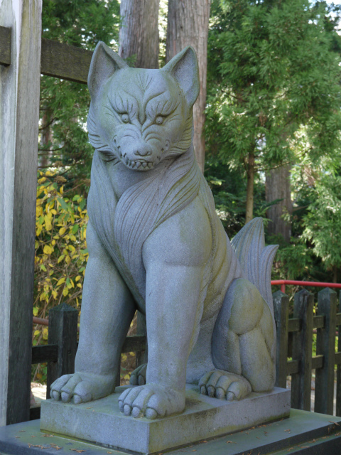 本殿の裏手の小さなお社には、こんなカッコイイお犬様が鎮座。