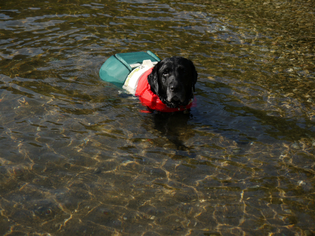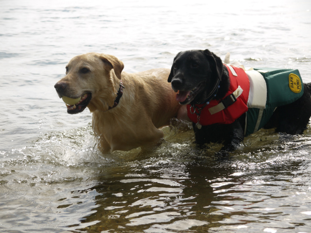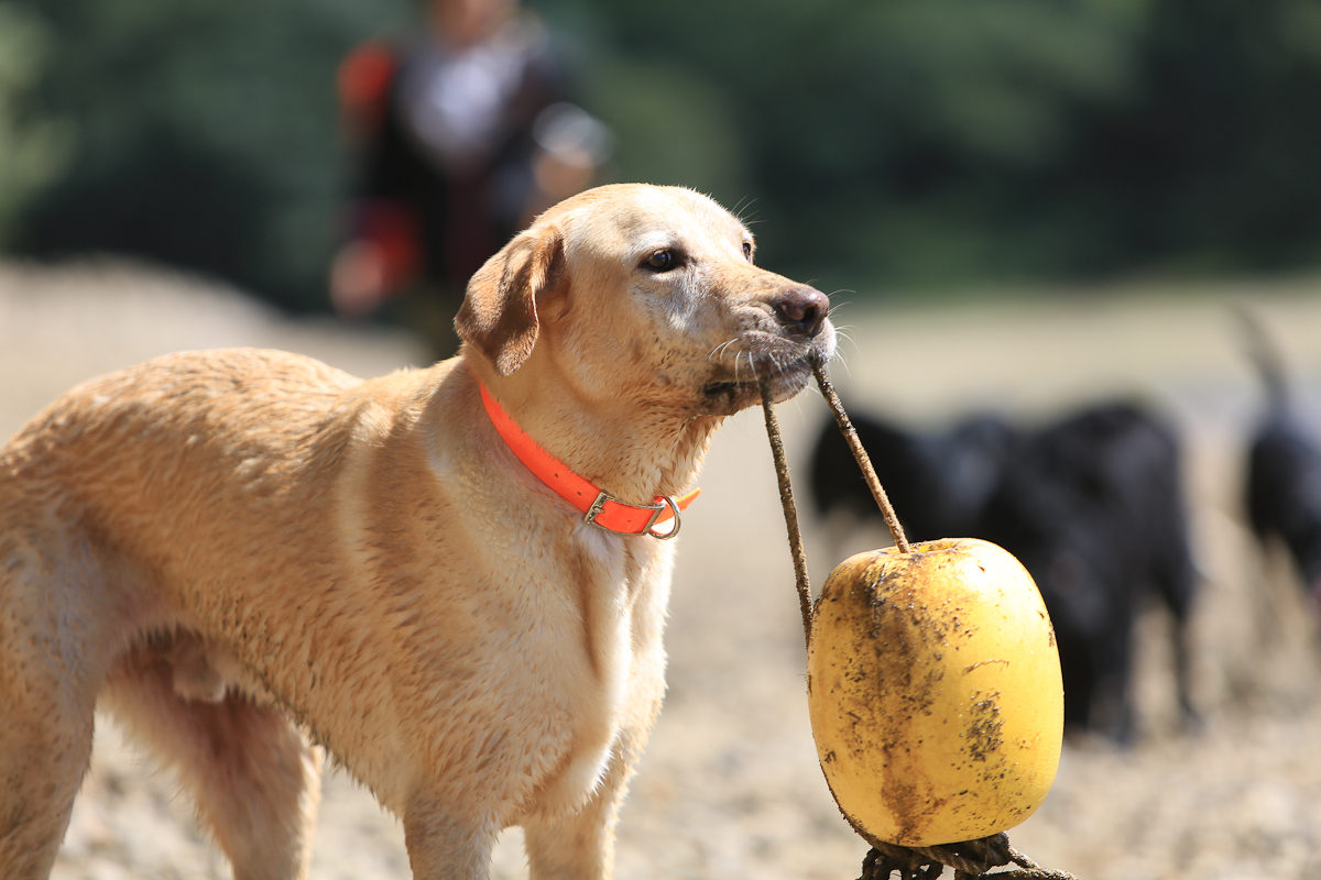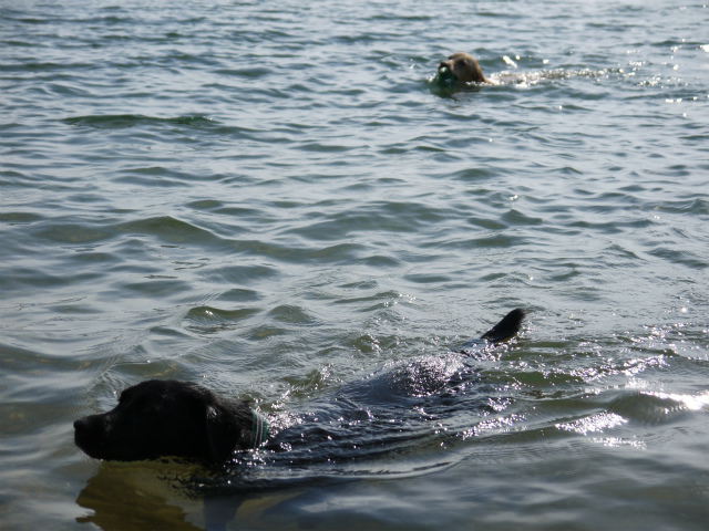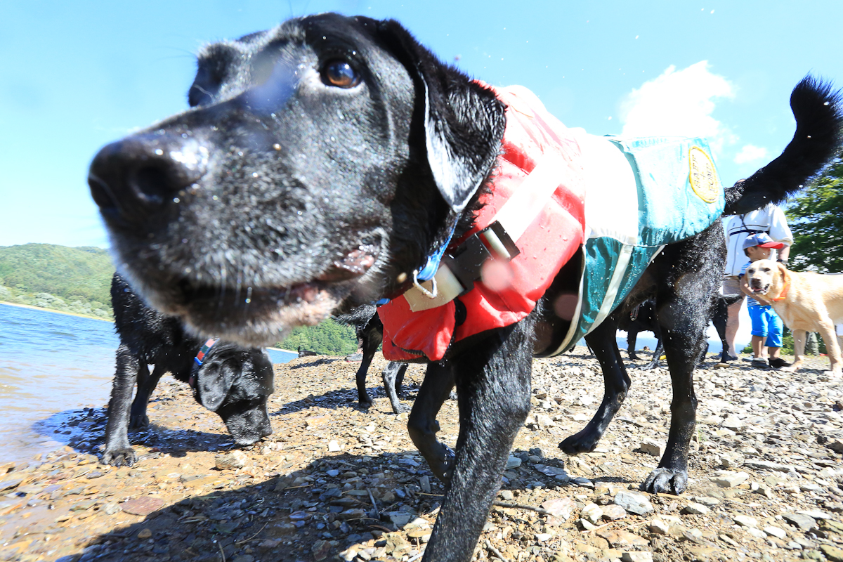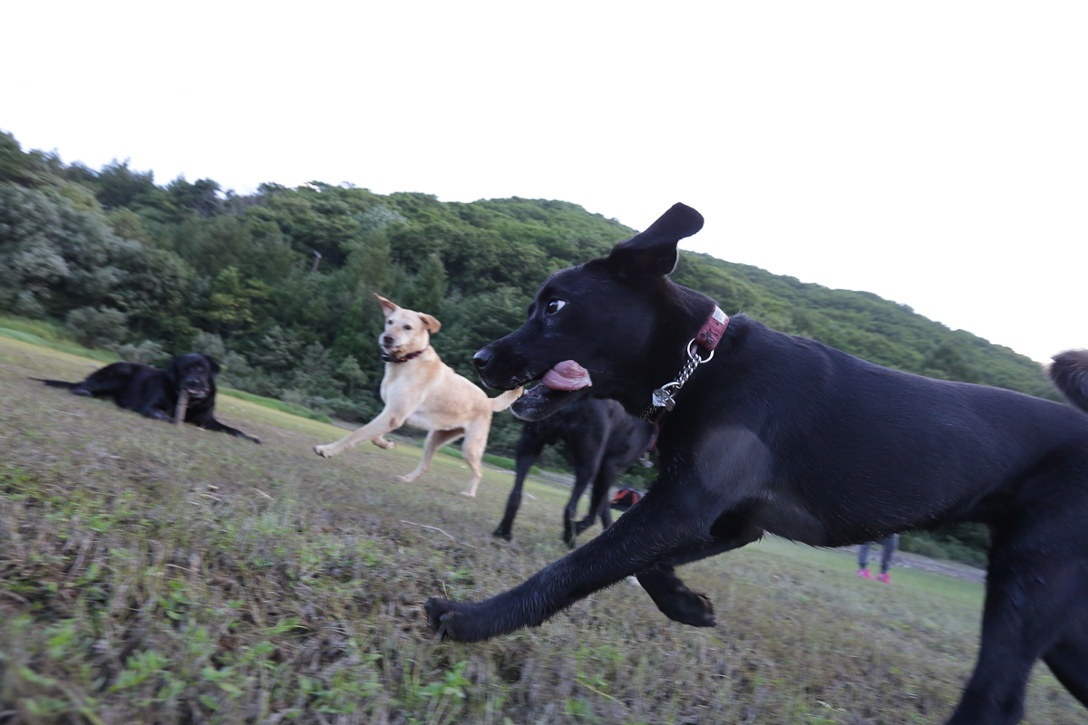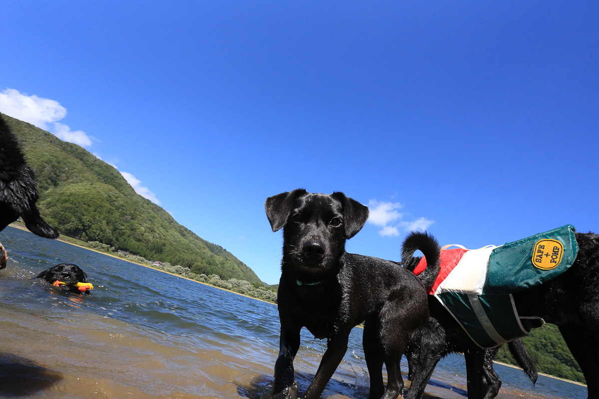 黒ラブ8頭に黄ラブ1頭。アルはスイミーのよう。