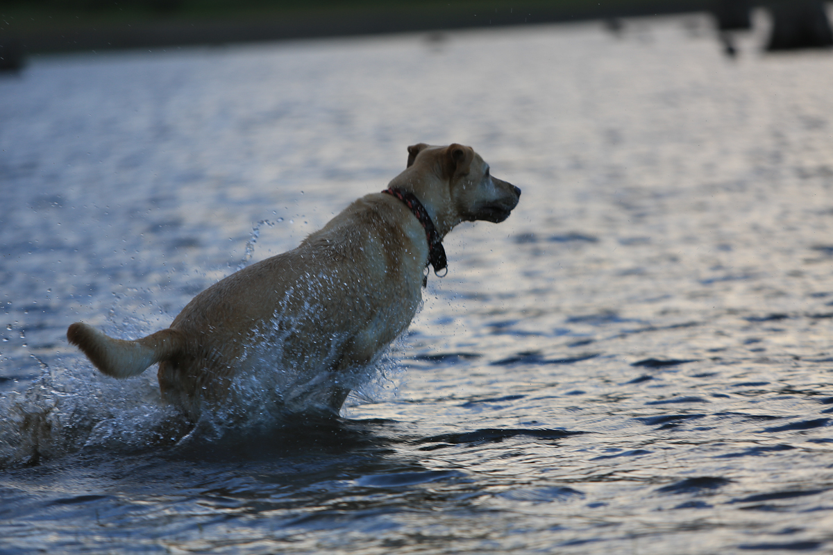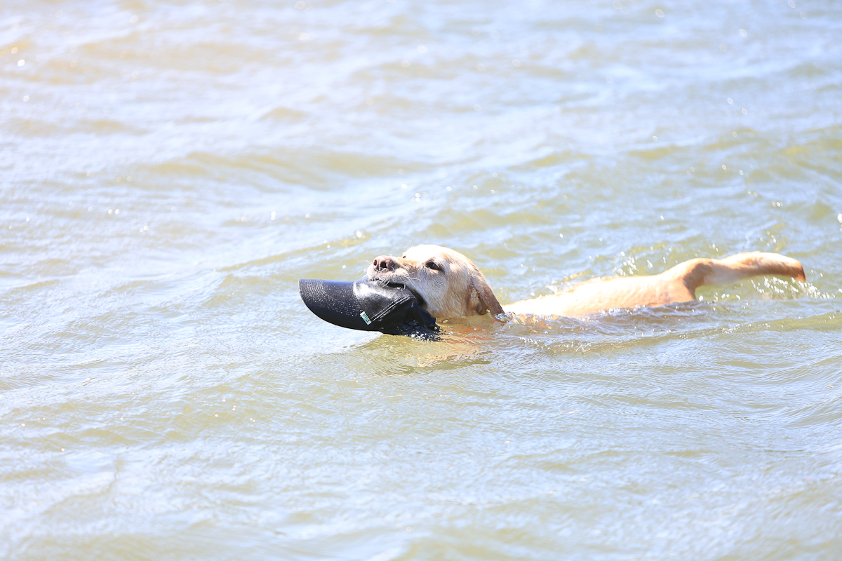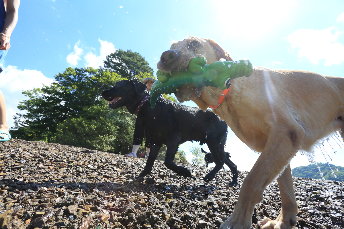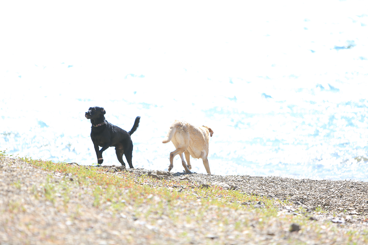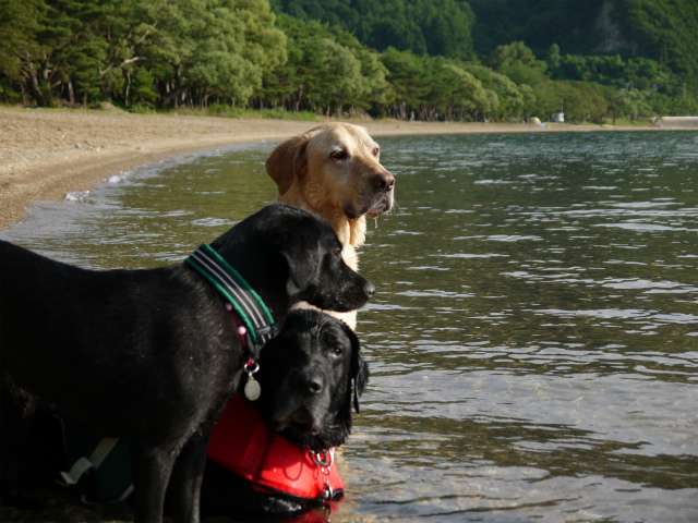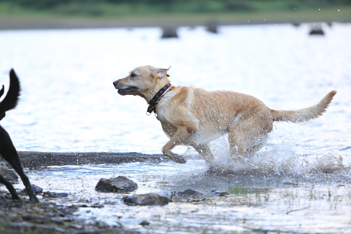 黒ラブ8頭に黄ラブ1頭。アルはスイミーのよう。