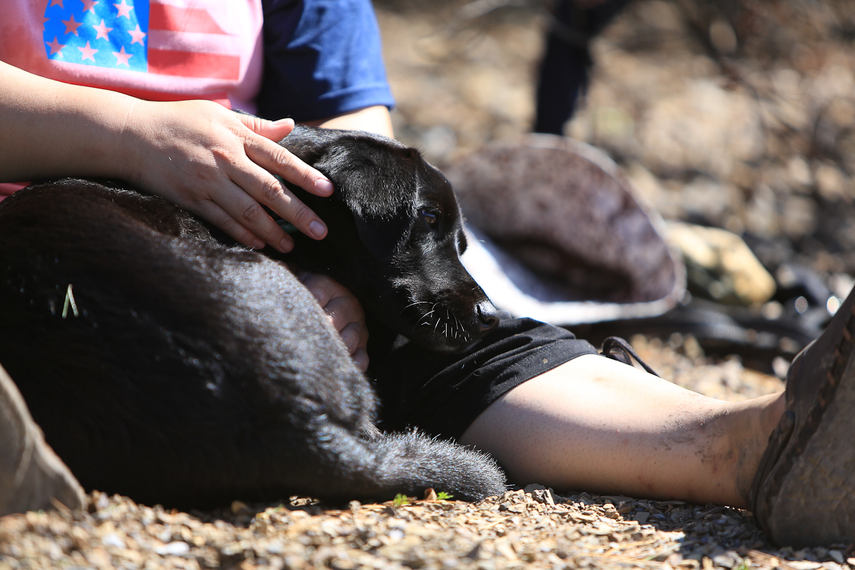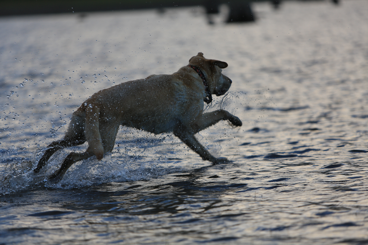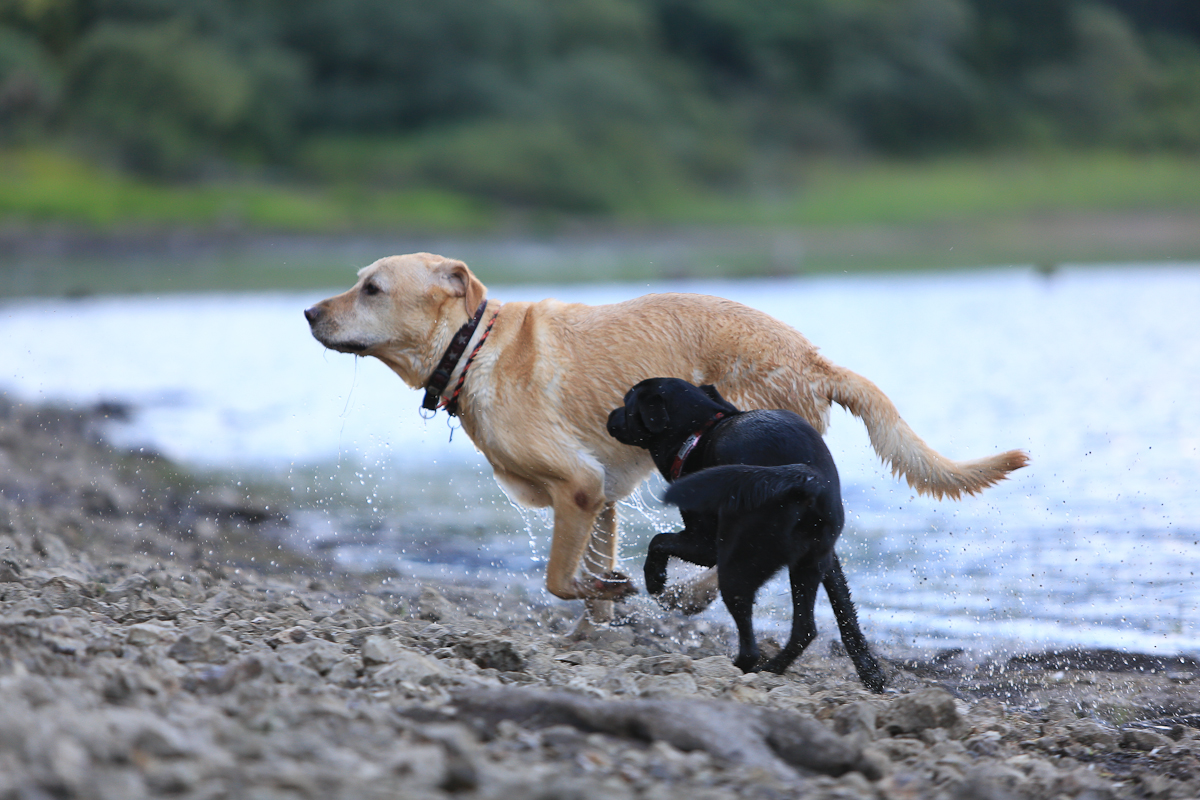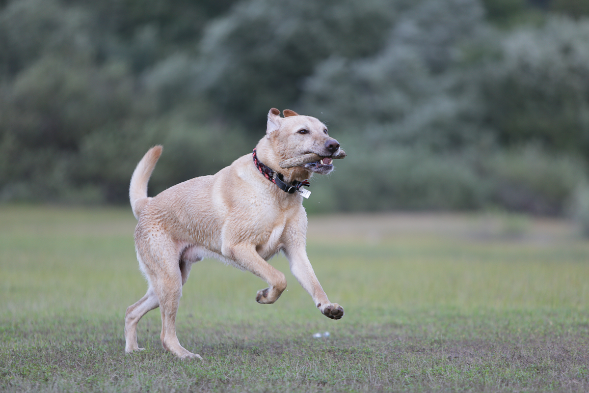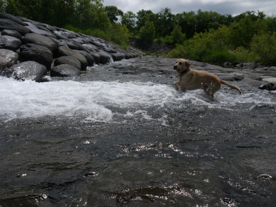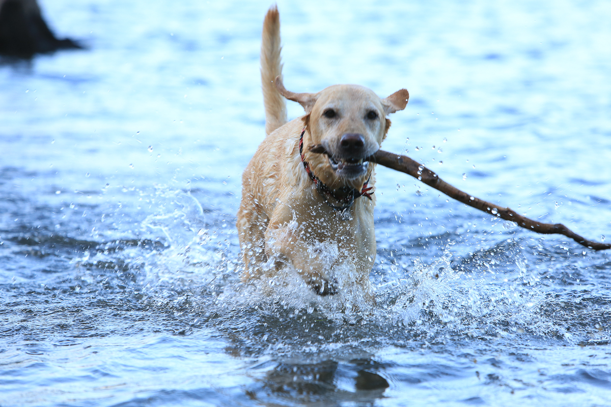 黒ラブ8頭に黄ラブ1頭。アルはスイミーのよう。