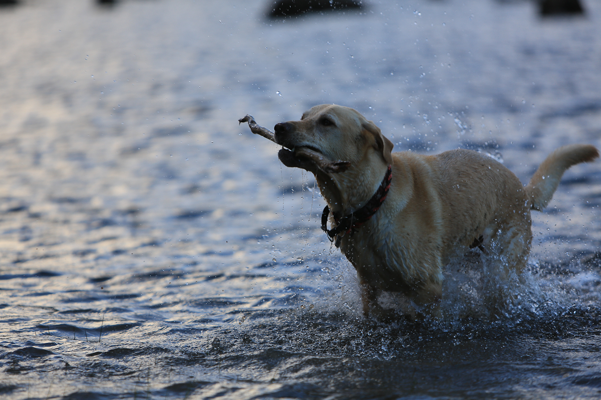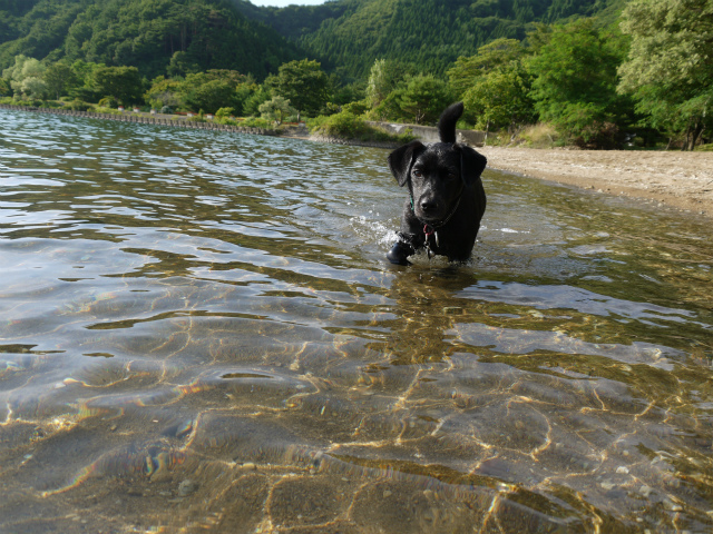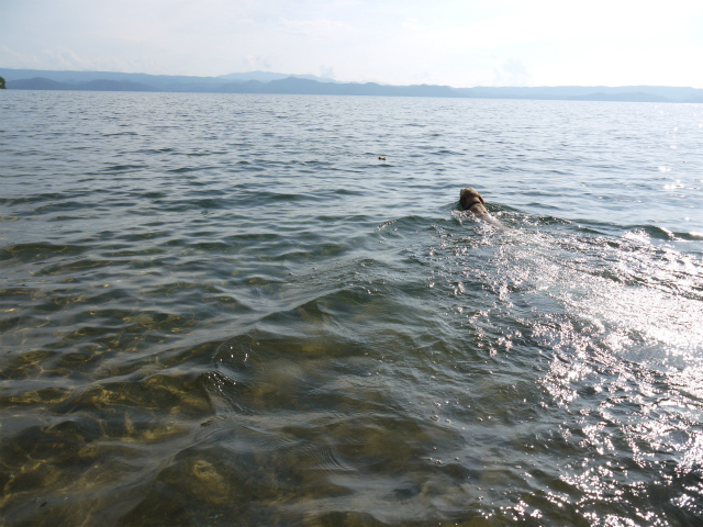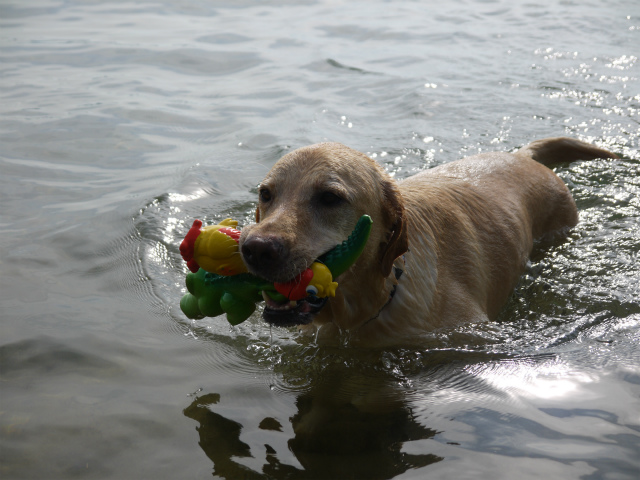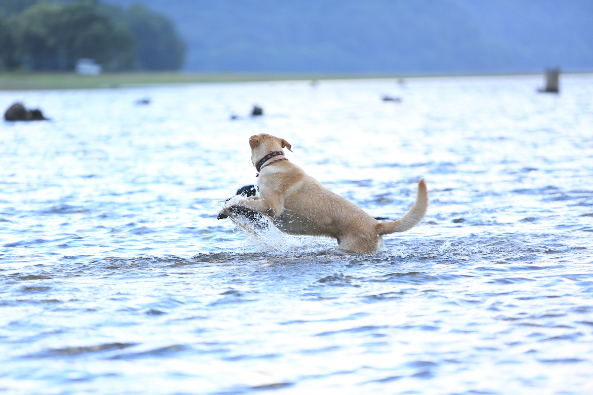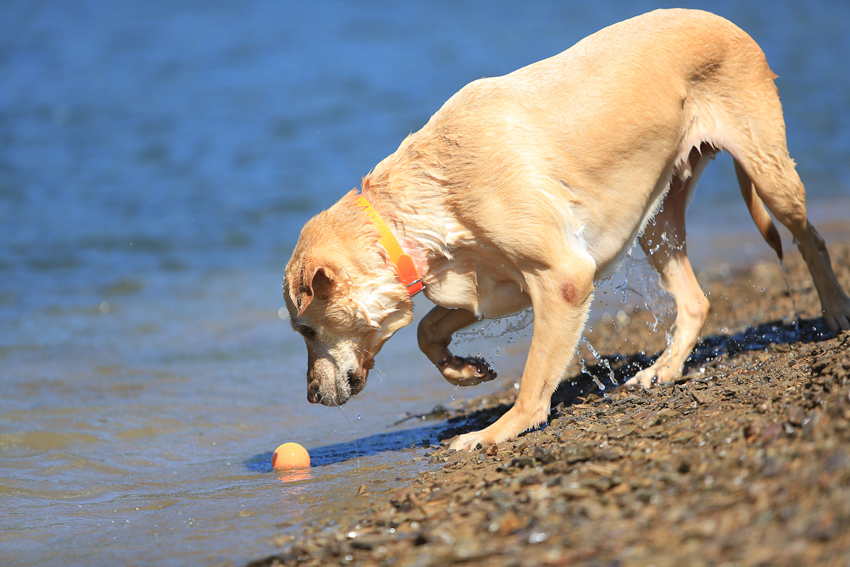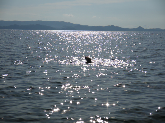 沖の方まで飛んでしまったボールを辺りを旋回して探し出し、潜って回収!