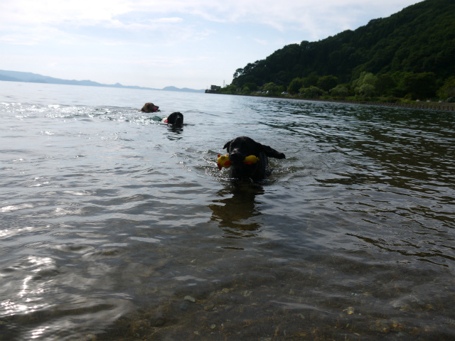 沖の方まで飛んでしまったボールを辺りを旋回して探し出し、潜って回収!